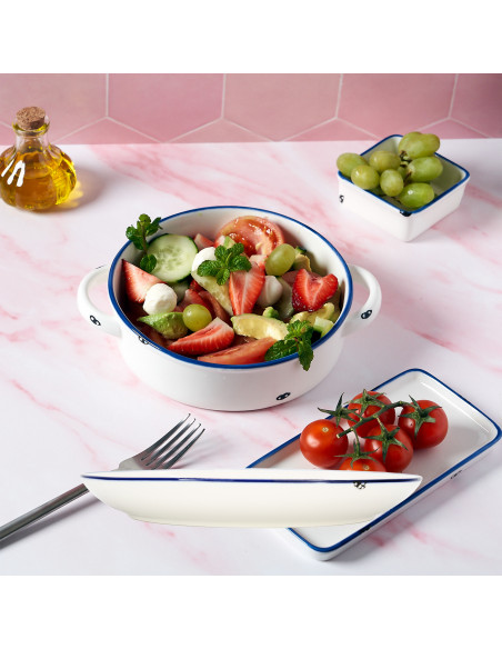 ALACENA AZUL is a really unique and original collection. Made of ivory white porcelain with blue details, it evokes old, enameled iron tableware, even reproducing the characteristic chips that appeared with use when the enamel was knocked and worn away.